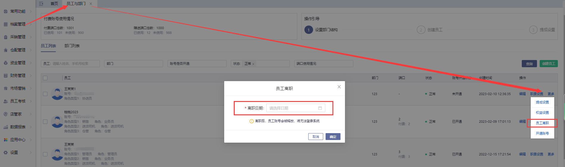 档案管理-员工与部门-更多-员工离职,选择离职日期点击确定即可。也可点击关闭账号。二者区别在于点了离职后员工与部门该账号显示停用默认不显示,关闭账号是还会显示。