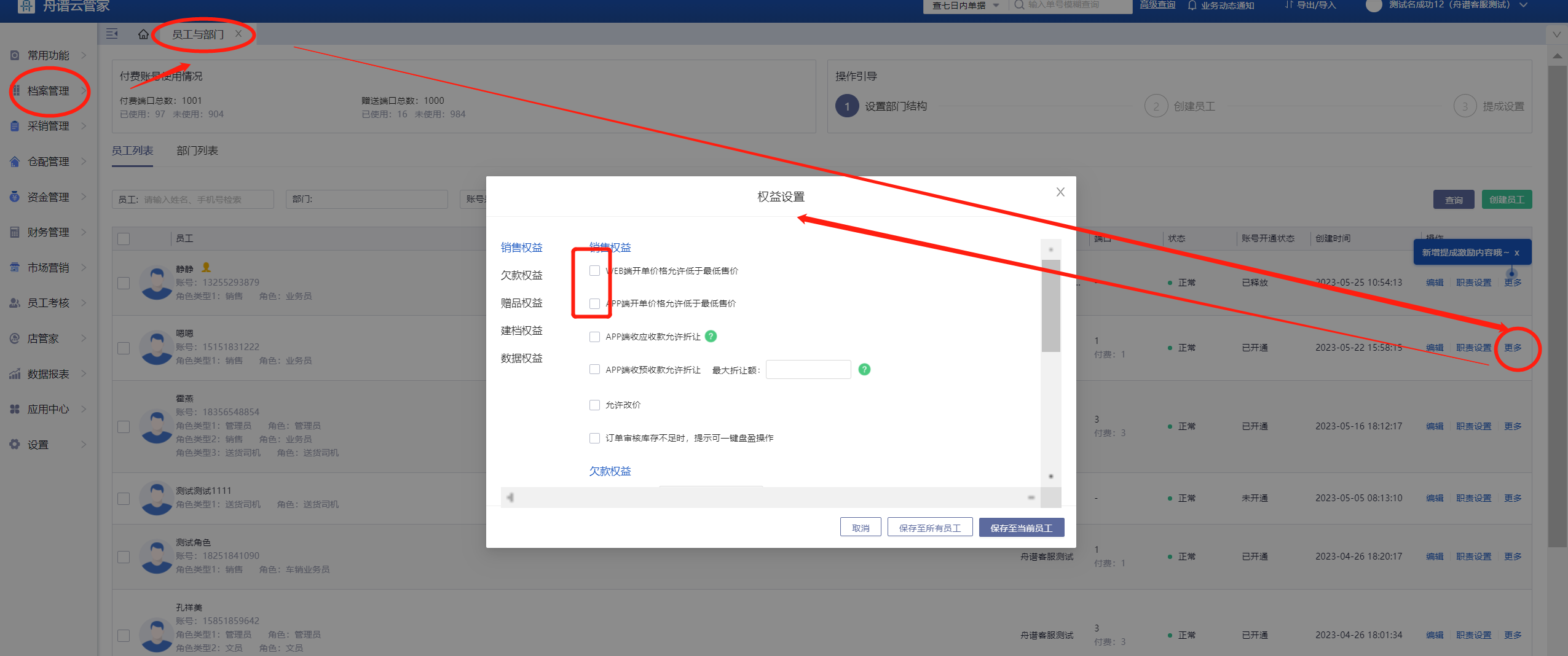 1.可以在档案管理-员工与部门-更多-权益设置,勾选即可。