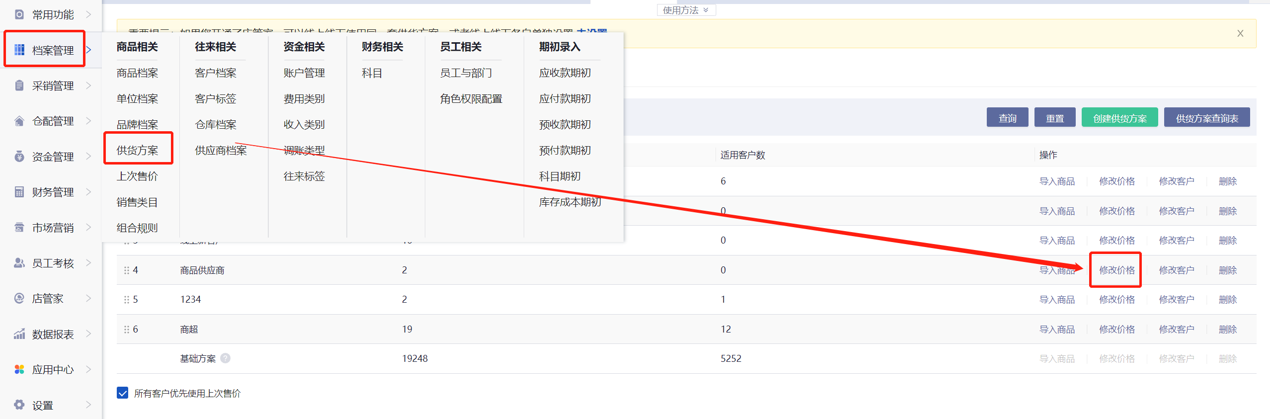 2、核实开单选择的客户设置供货方案,需要把新增的商品加进供货方案。