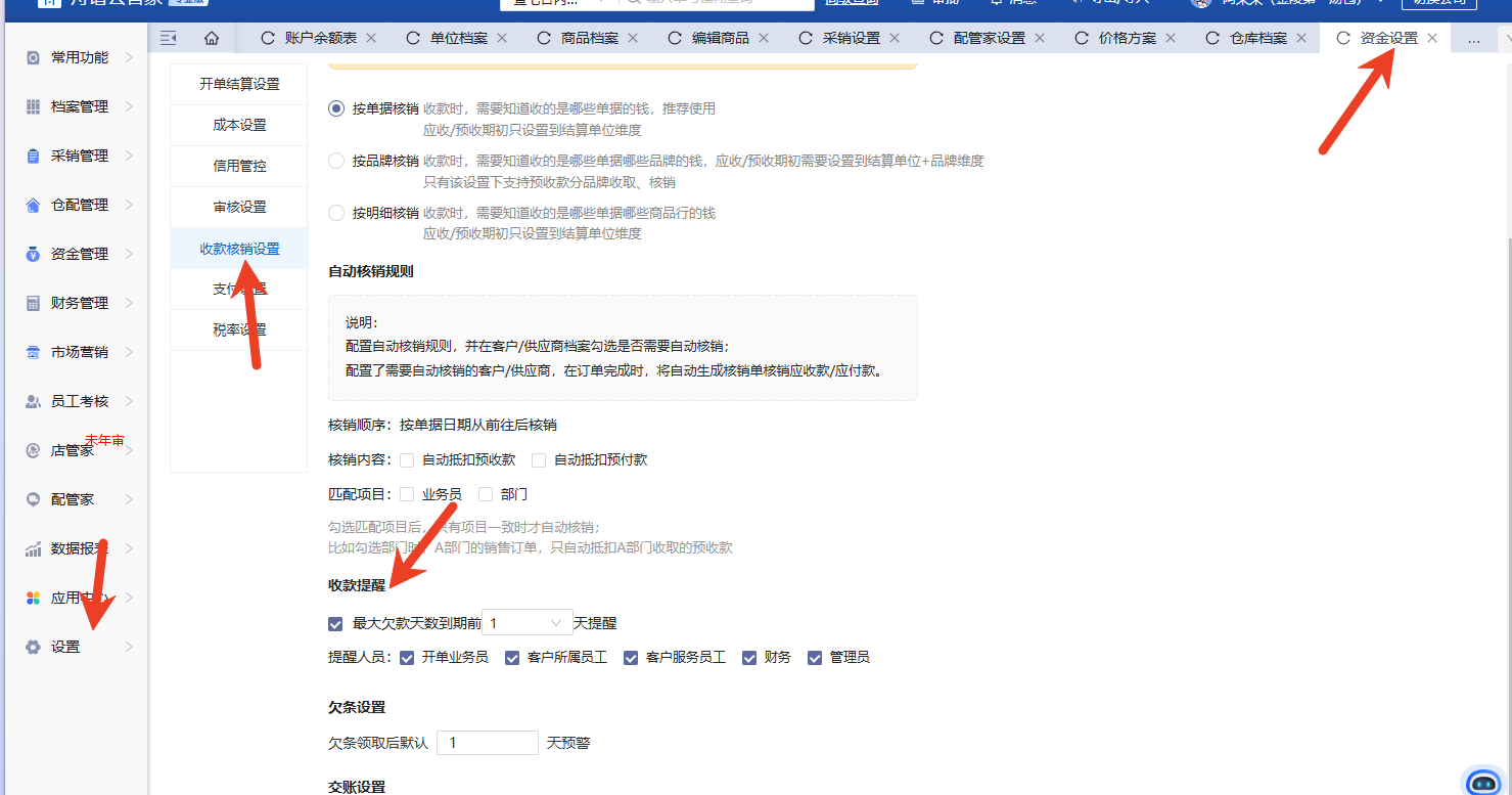 在设置-资金设置-收款核销设置收款提醒,设置后会发送到提醒人员的消息通知。人员需开启订阅通知。