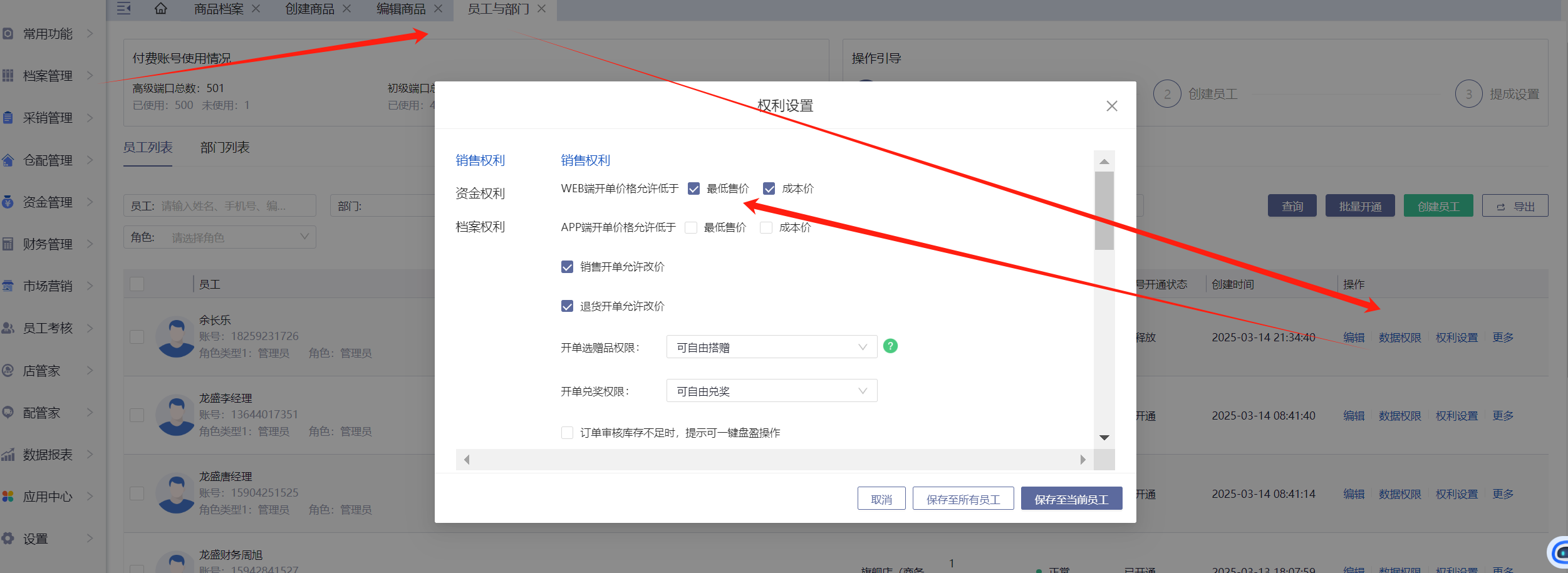 2.如果不修改人员权限的情况下,可以设置标签,勾选后选择该标签即可低于成本价开单,方便统计