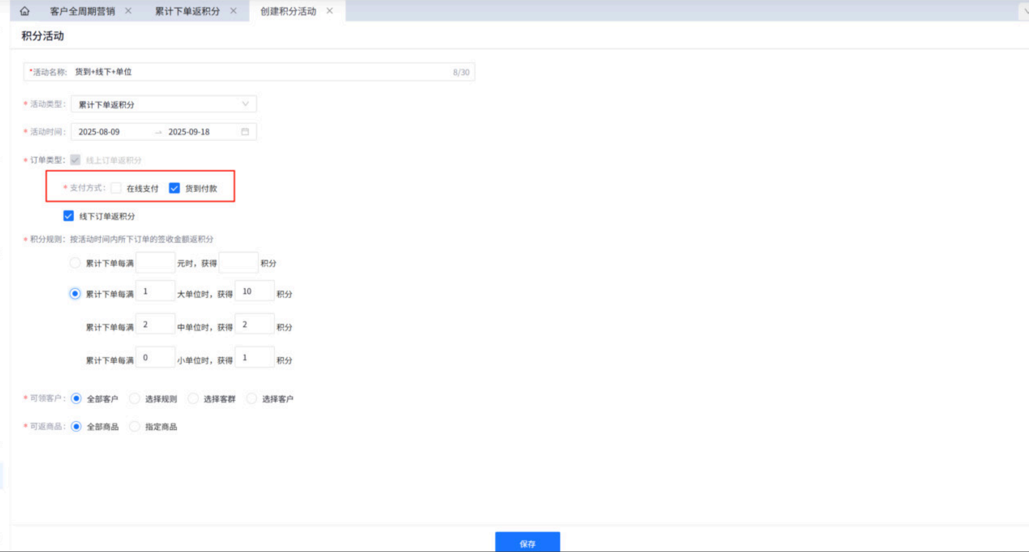 勾选【货到付款】则货到付款的线上订单可以按照规则返积分。