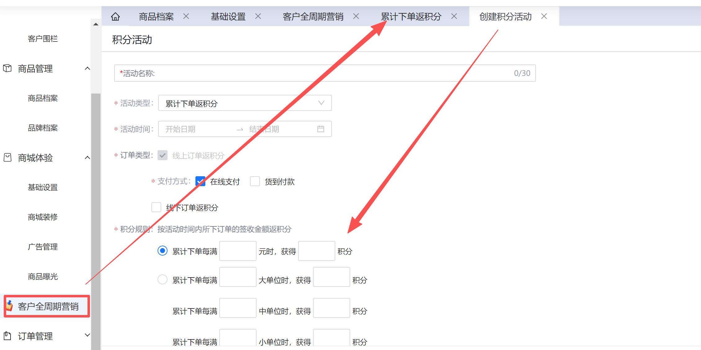 支持设置大、中、小单位下单返积分,且至少填写一种单位规则。