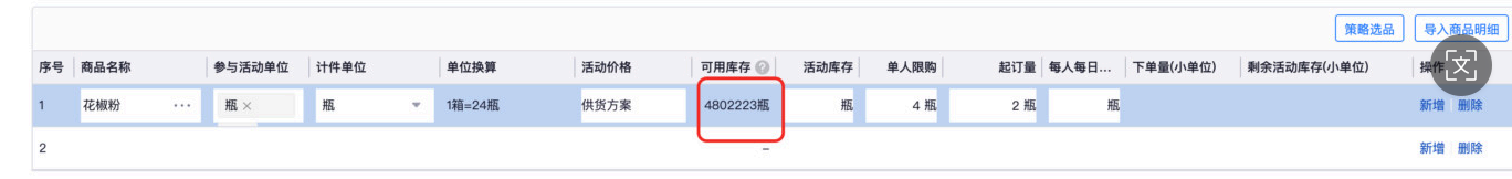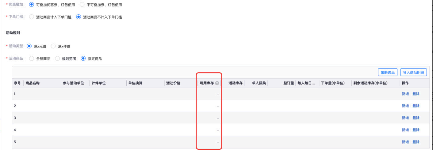 促销活动中选择活动商品后展示可售库存
