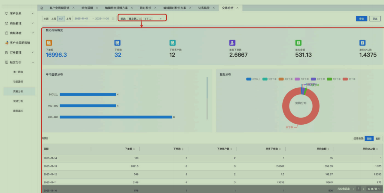 【旗舰版/平台版】交易分析⽀持筛选渠道以及导出明细列表?