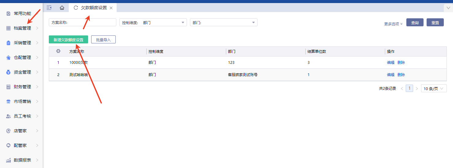可以。需在档案管理-欠款额度设置-新增欠款额度设置。此处设置是针对部门+客户维度设置欠款额度。