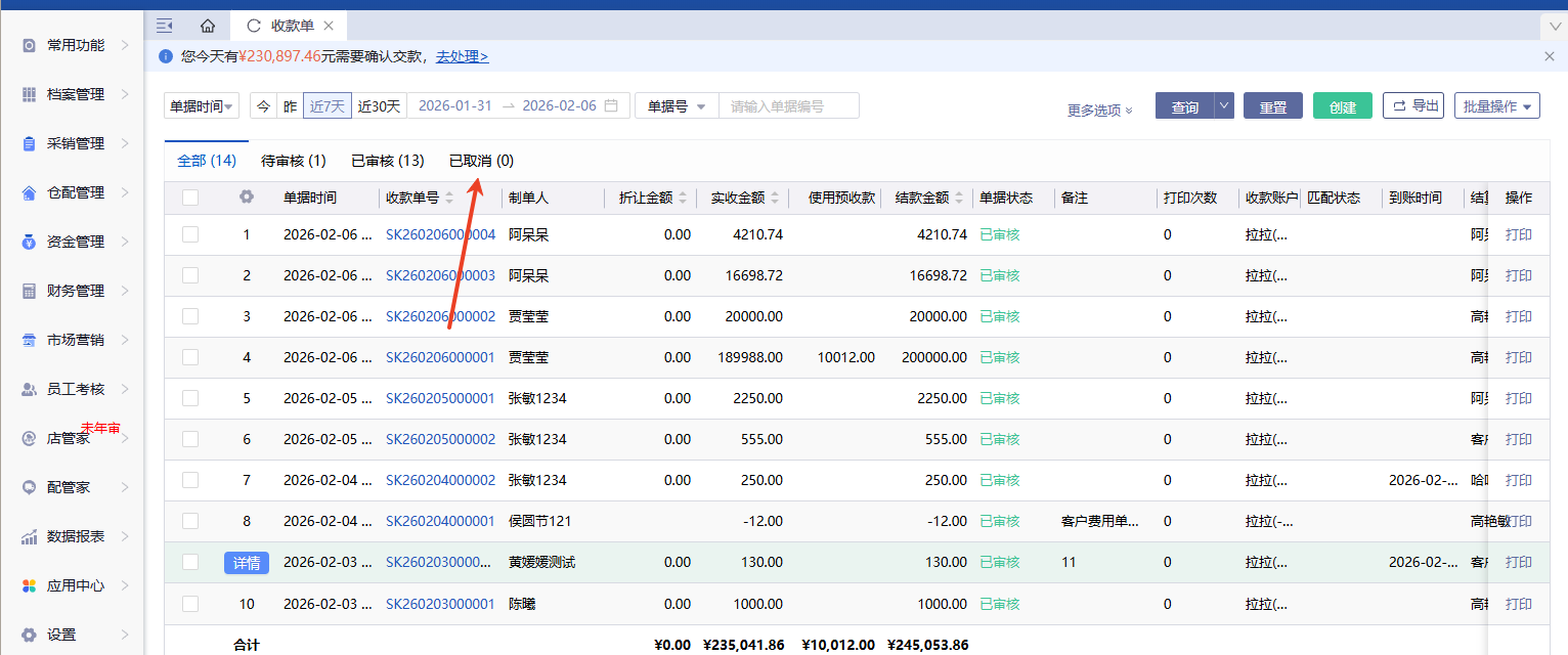 已取消的收款单怎么查?