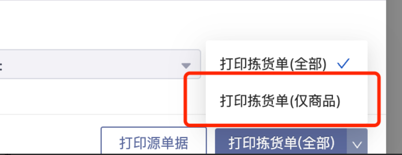 右下角打印拣货单时,可选择打印拣货单(仅商品),这样就只打印下半部分商品明细了,不打印上方的订单信息。