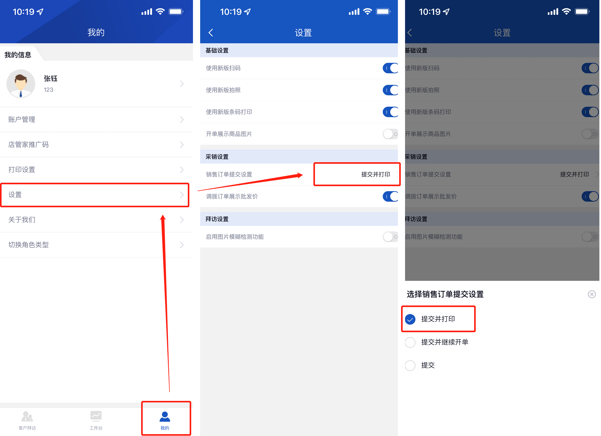 需要在手机端我的-设置-销售订单提交设置中选择提交并打印。