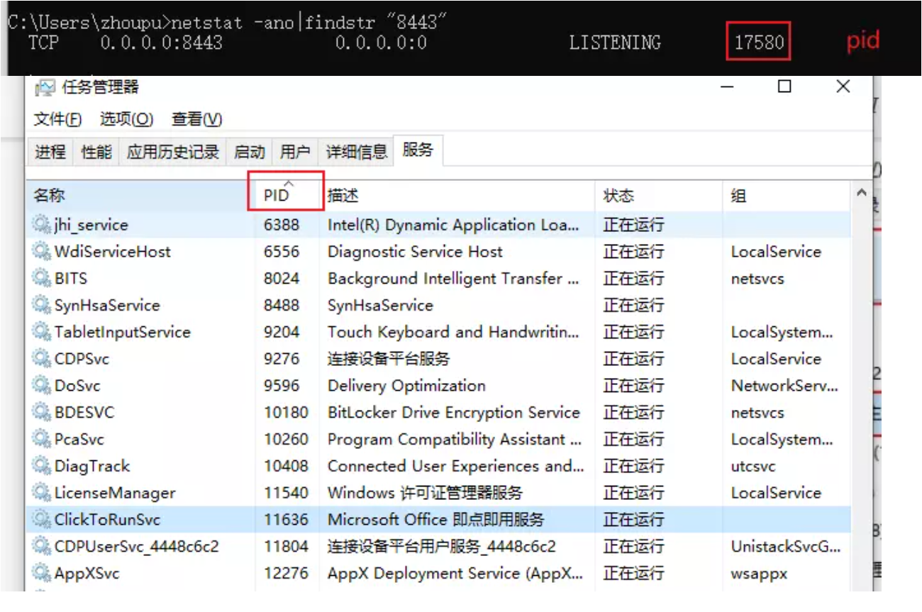 2)确有其他程序占用:在cmd命令框查找占用端口的程序pid:netstat -ano|findstr "8443"找到之后同样在任务管理器里面找到该进程,确认是无关进程后,可以结束掉。