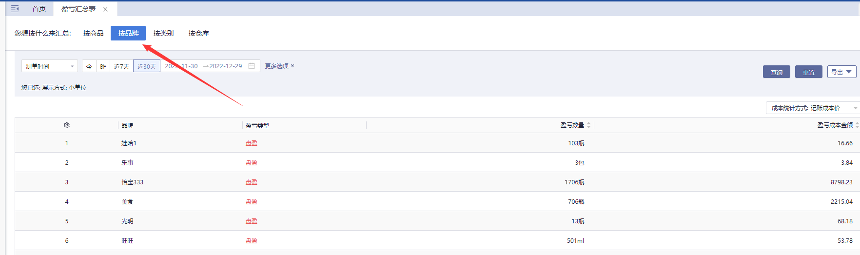 可以在数据报表-盈亏汇总表中选择按品牌查看哦。