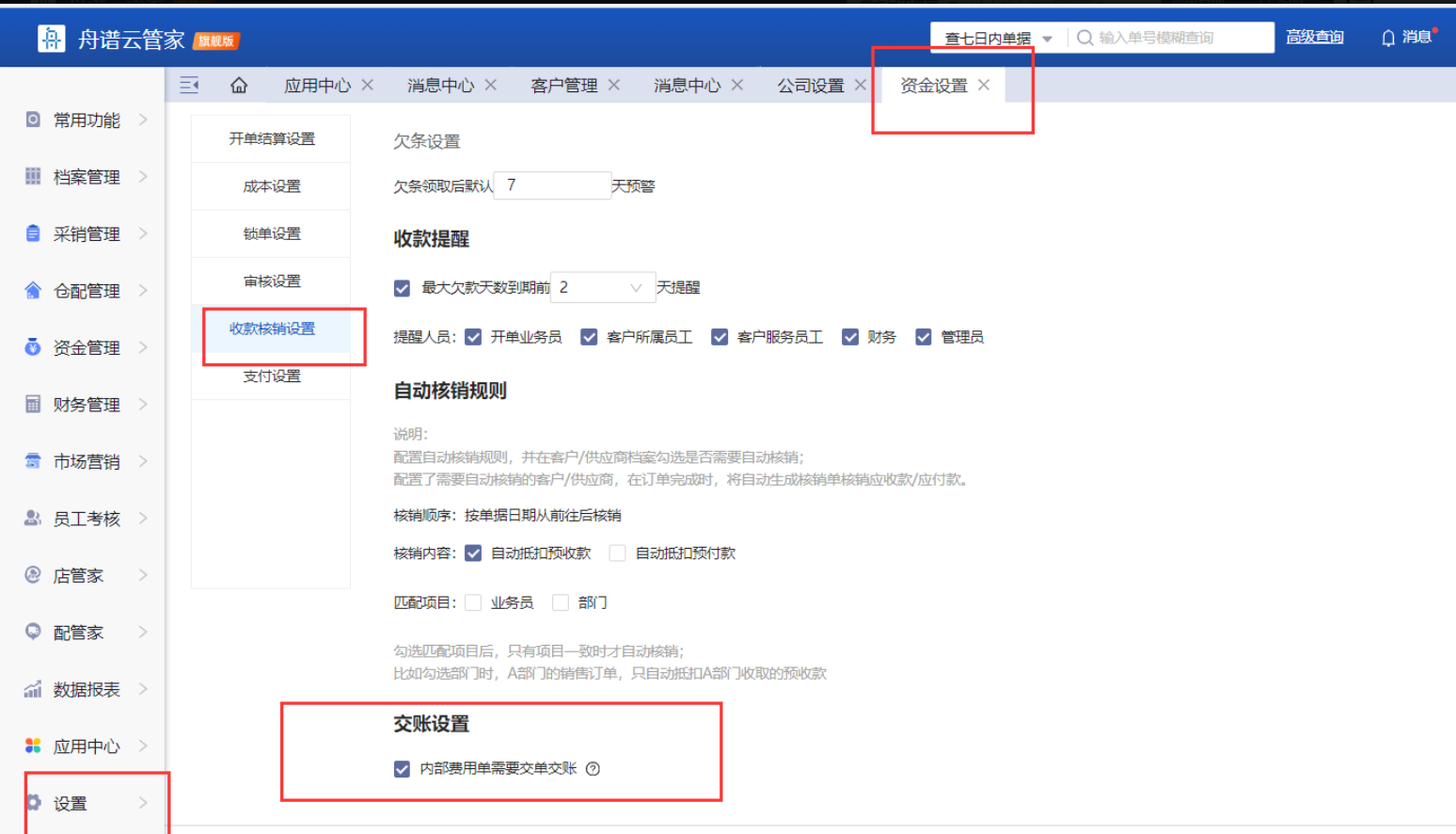 操作入口:设置-资金设置-收款核销设置,勾选内部费用单需要交单交账。