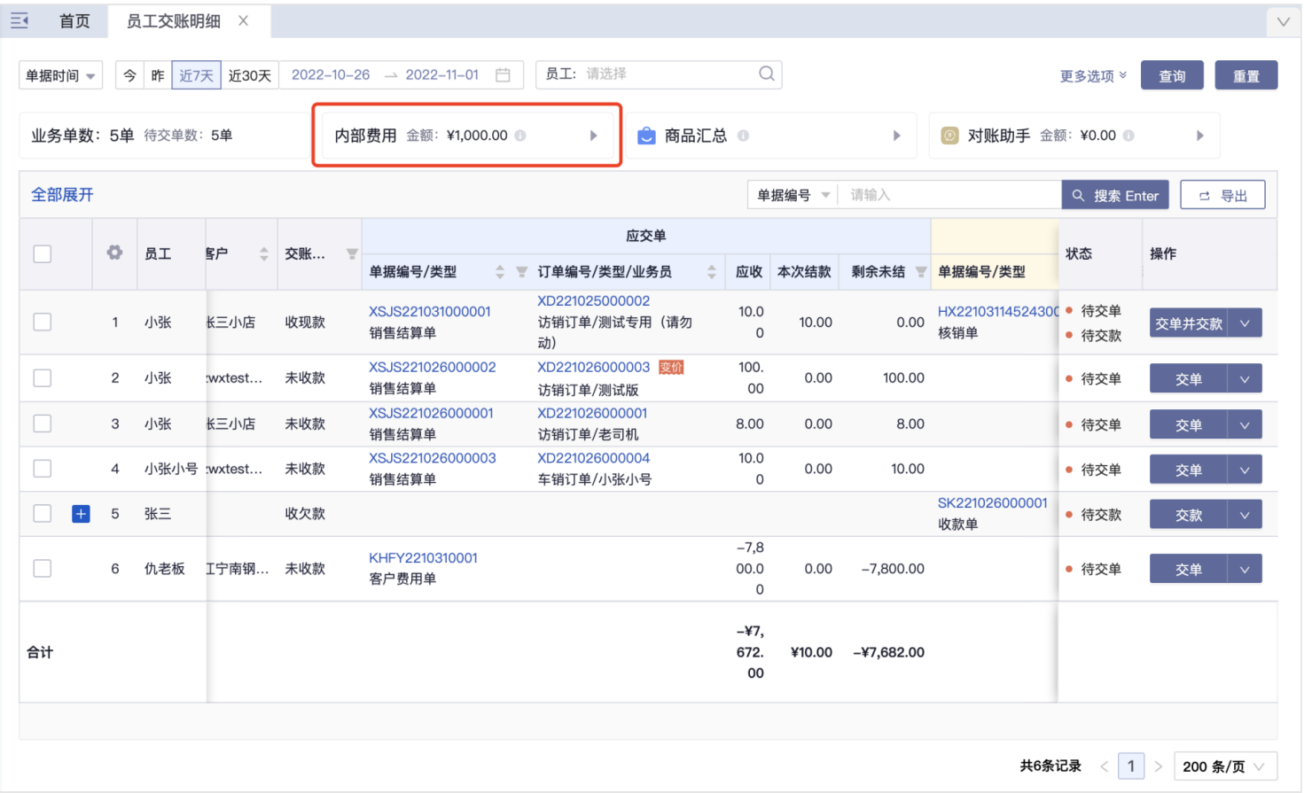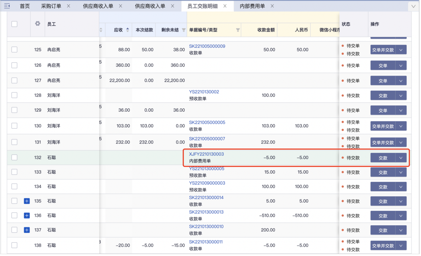 2. 明细页,表格会展示内部费用单,支持对内部费用单进行交款;