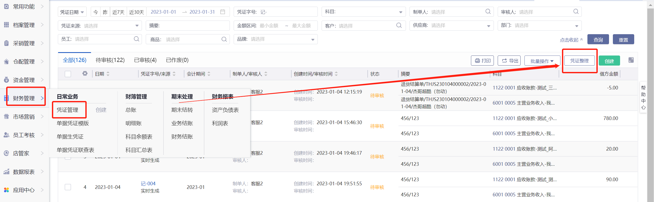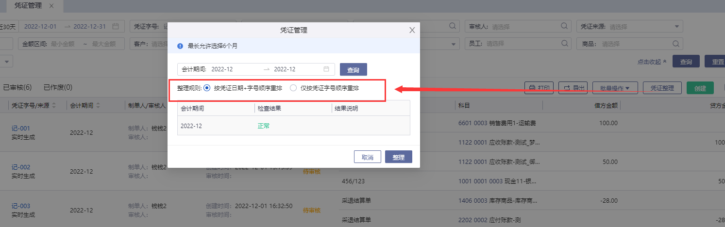 可以在财务管理-凭证管理中点击凭证整理进行排序,选择会计期间,整理规则查询后,点击整理,整理后会按新的顺序排序,不能恢复,请谨慎操作。