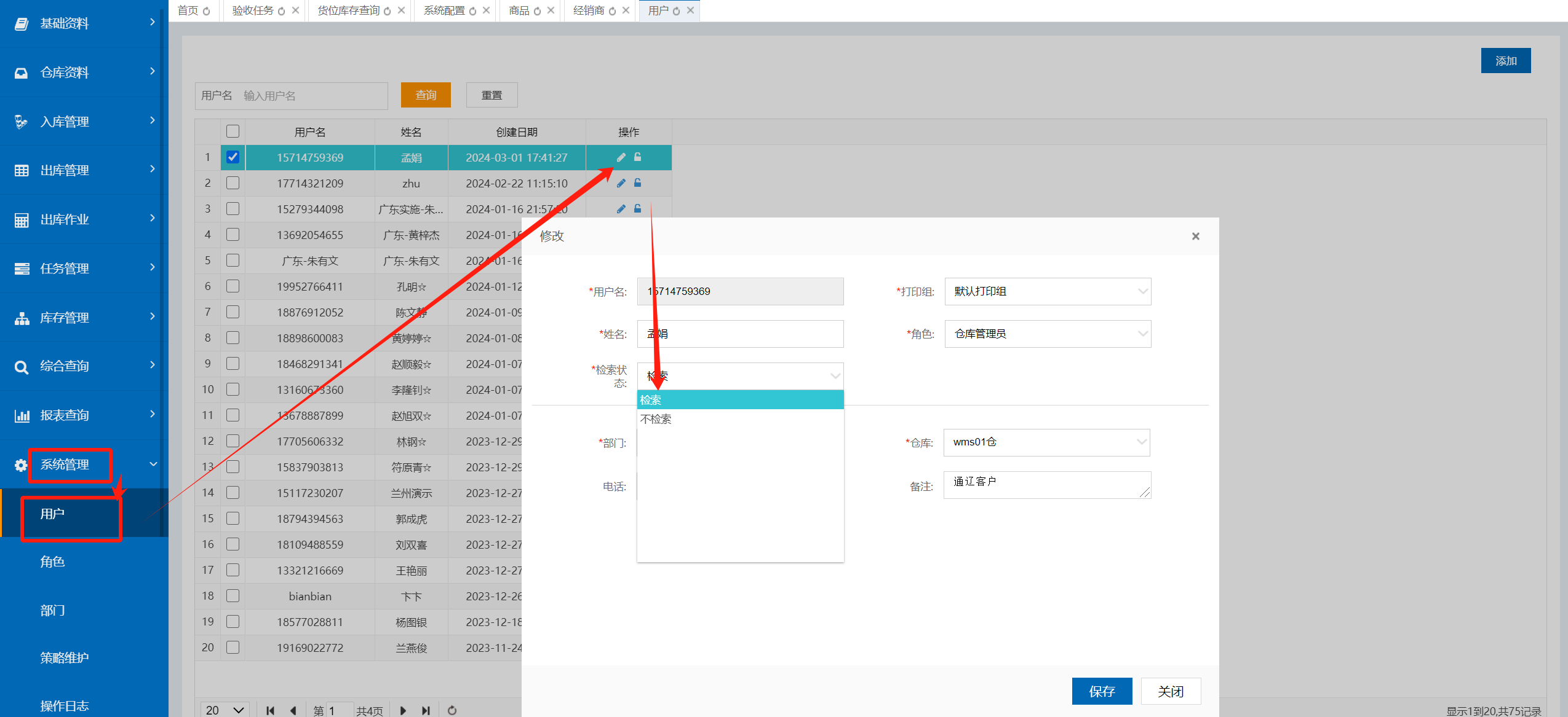 操作入口:WMS—系统管理—用户—选择用户—操作修改不检索