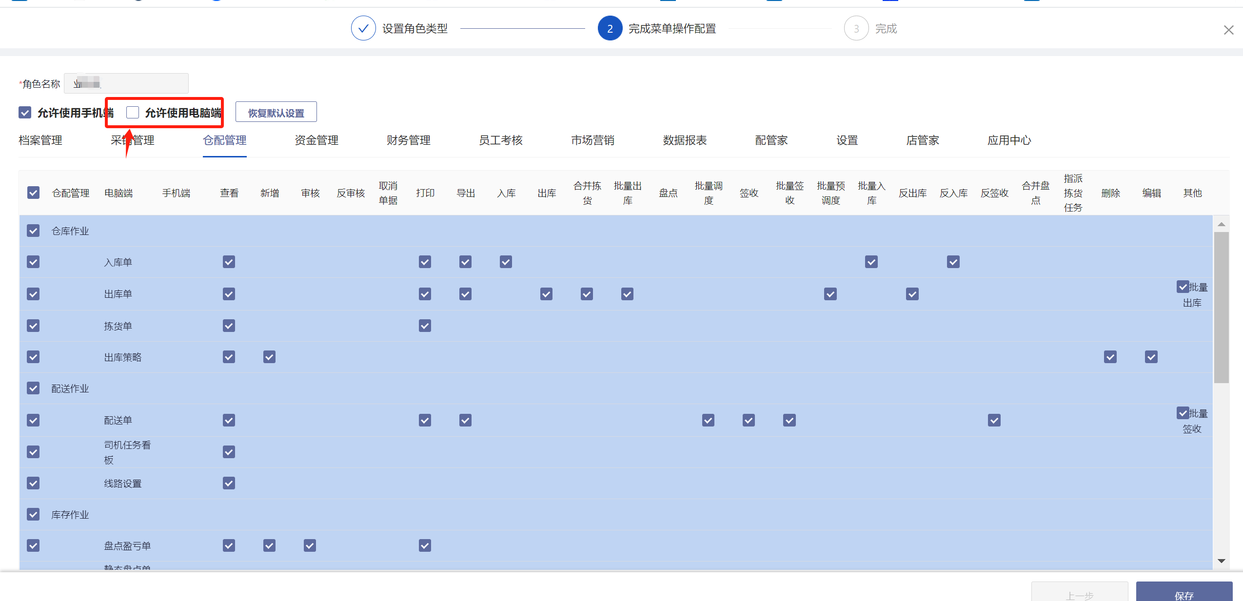 档案管理--角色权限配置--按角色设置--勾选”允许使用电脑端“。