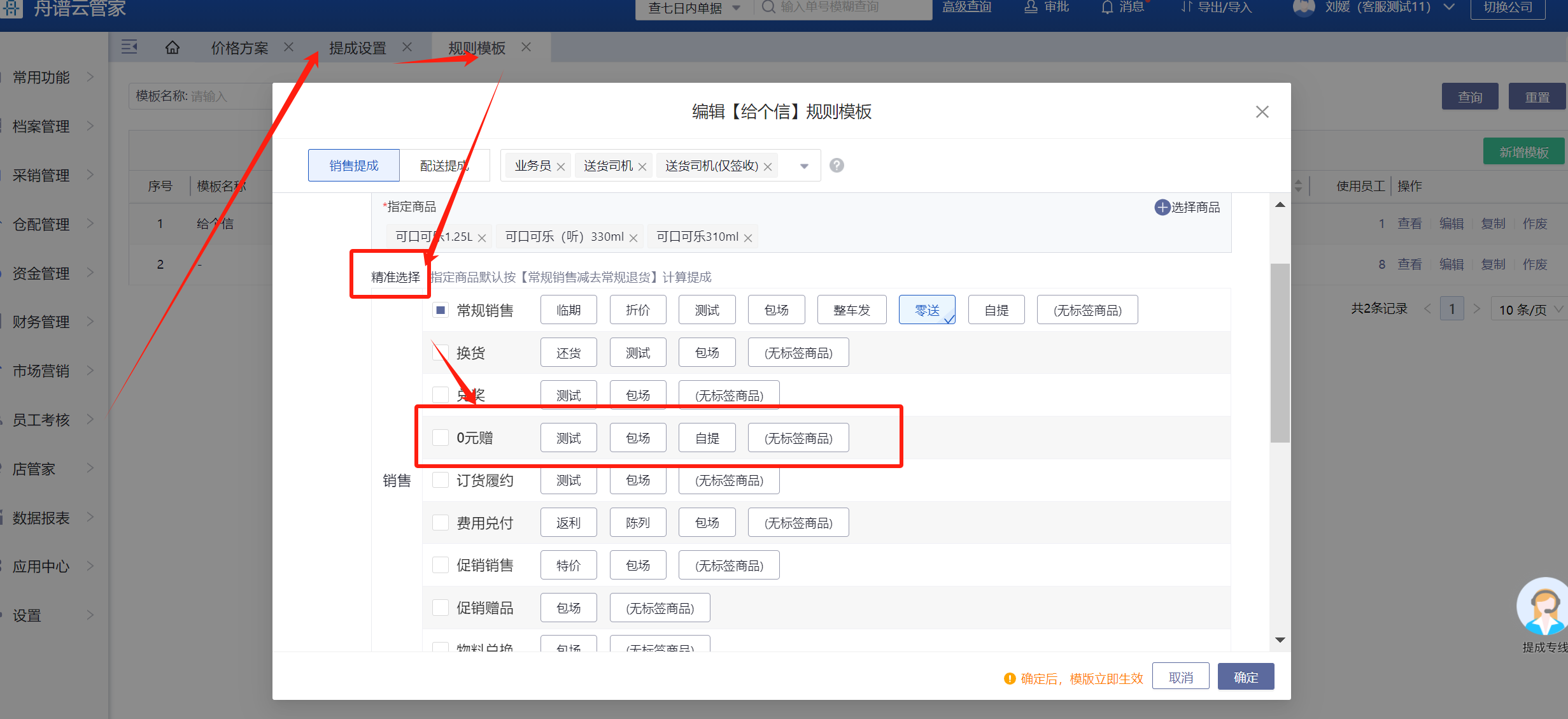 提成设置--选择提成方案后--编辑--0元赠不勾选即可