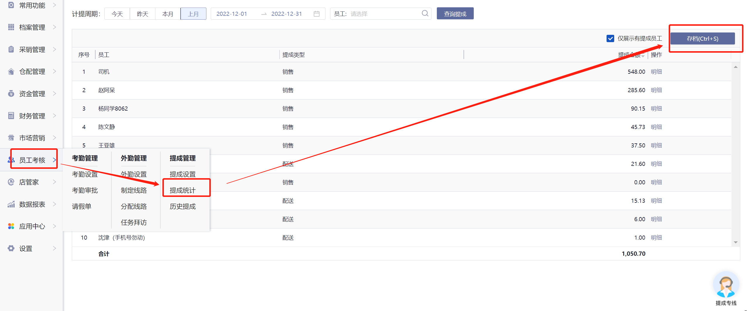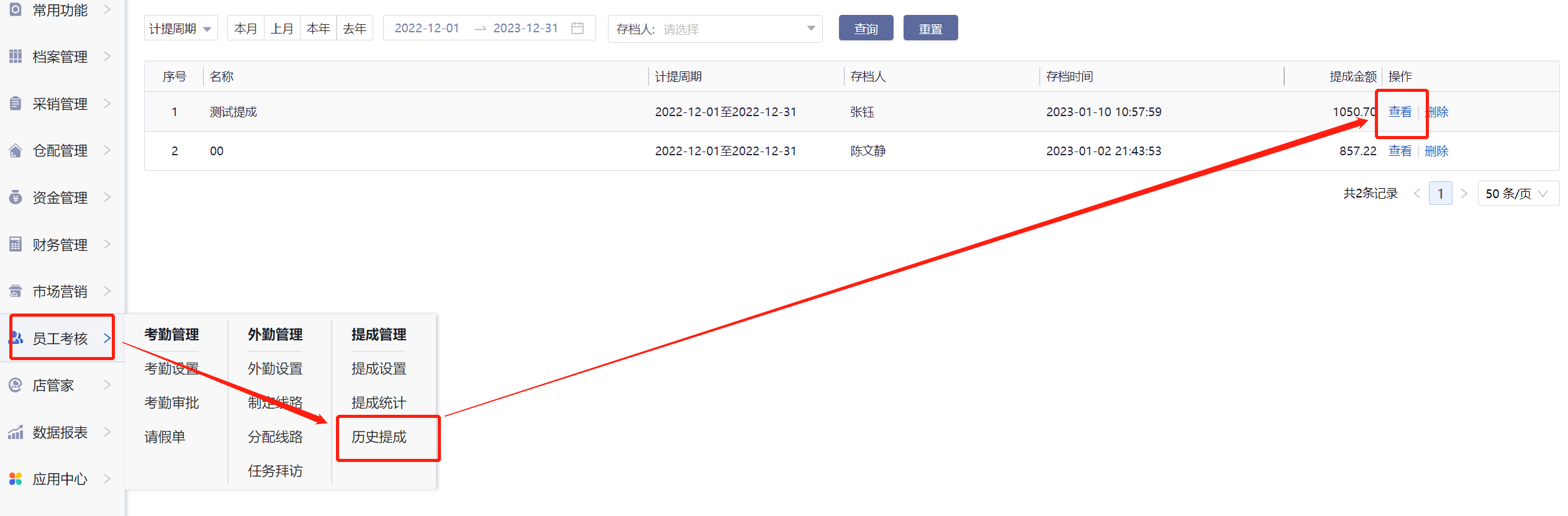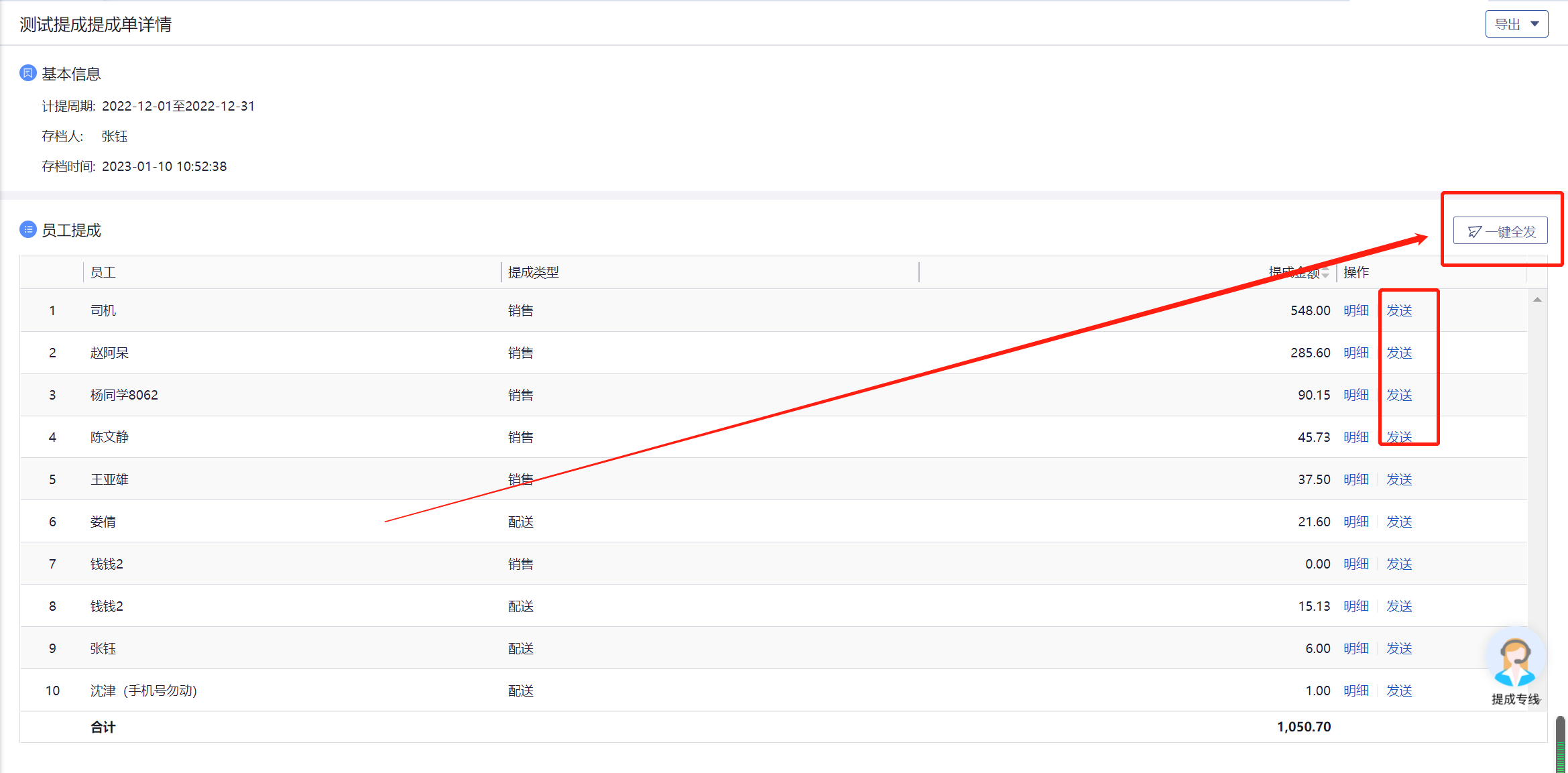 3、员工考核-历史提成-查看提成,可一键全发或者单独发送