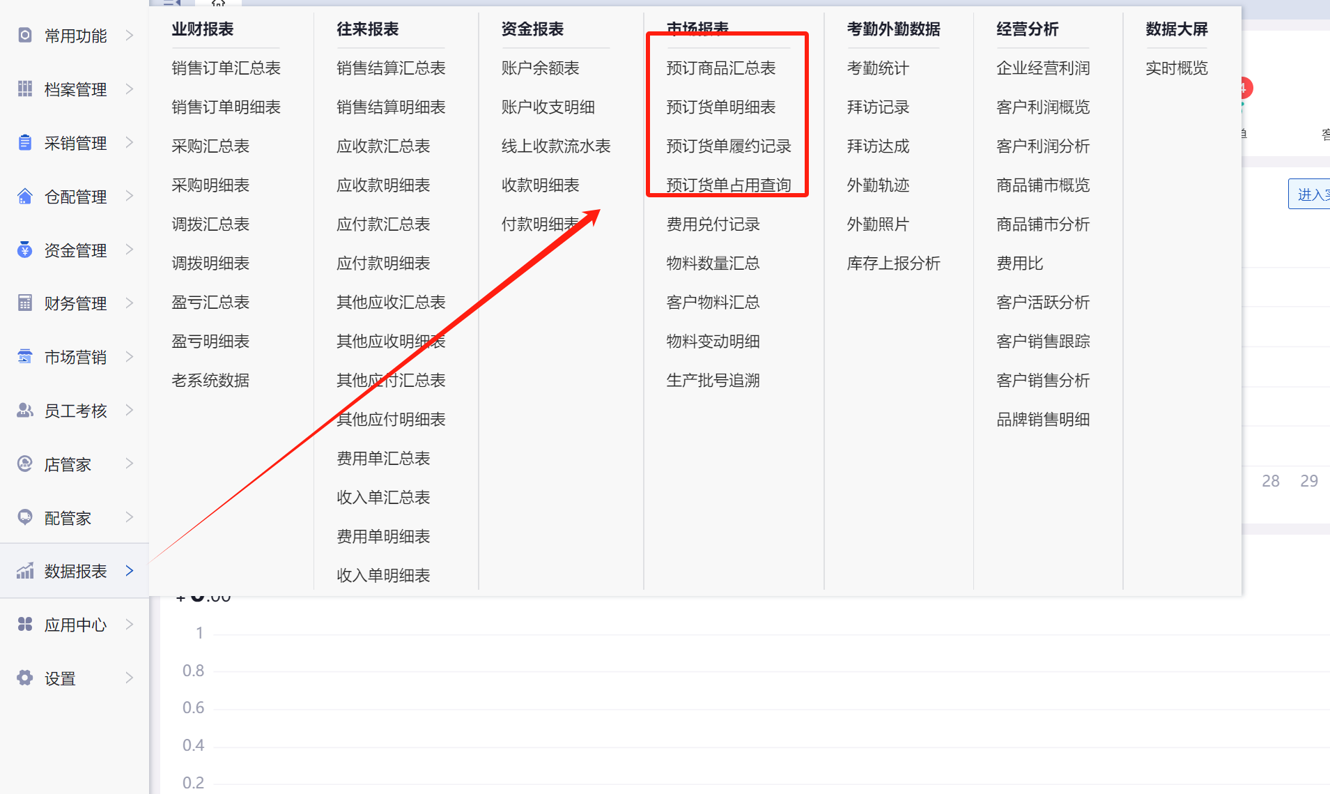 1、商品类预订货:数据报表--预定商品汇总表,进行查看预订商品。