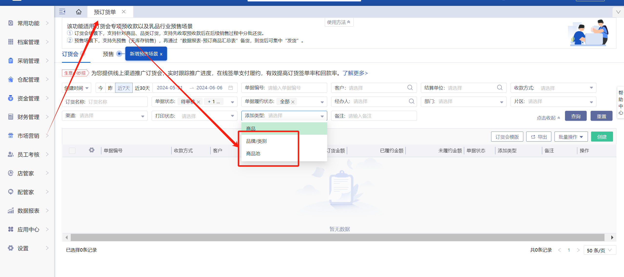 2、品牌、商品池查询:市场营销--预订货单,类型选择品牌/类别、商品池,可以查看未履约金额。