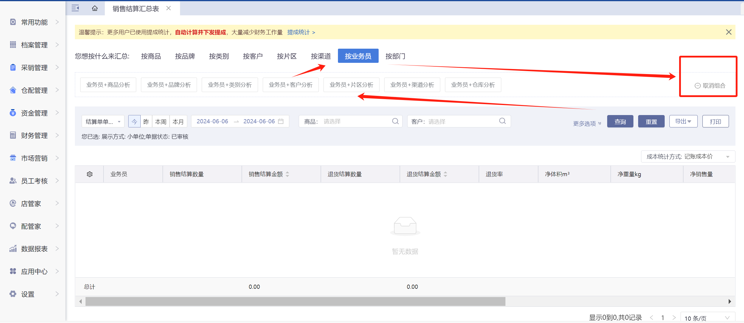 电脑端-数据报表-销售结算汇总表按按业务员,展开组合汇总