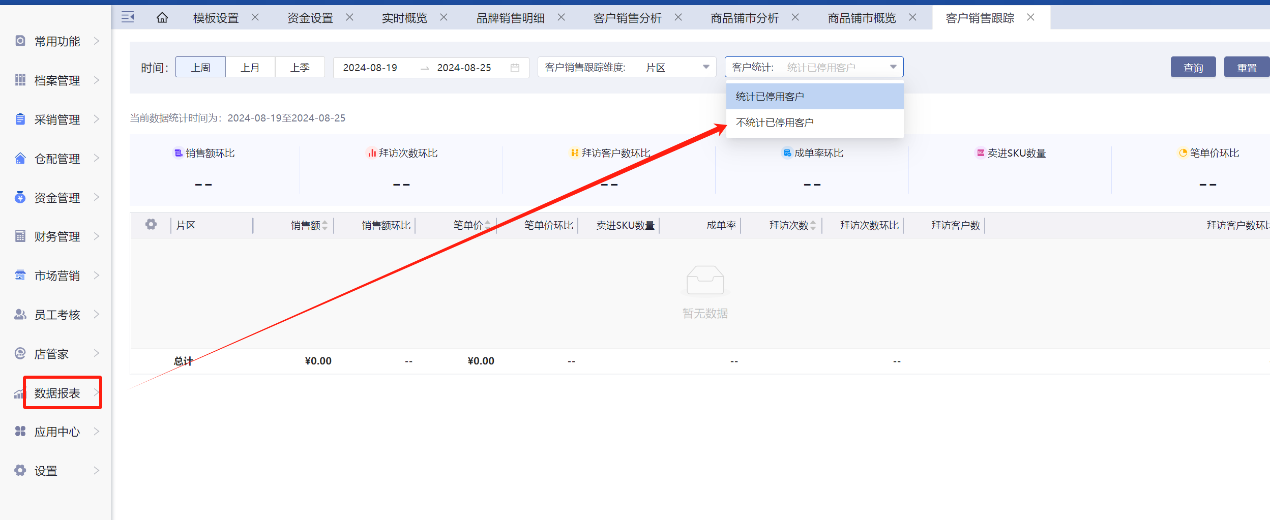 客户统计:选择不统计已停用客户即可。