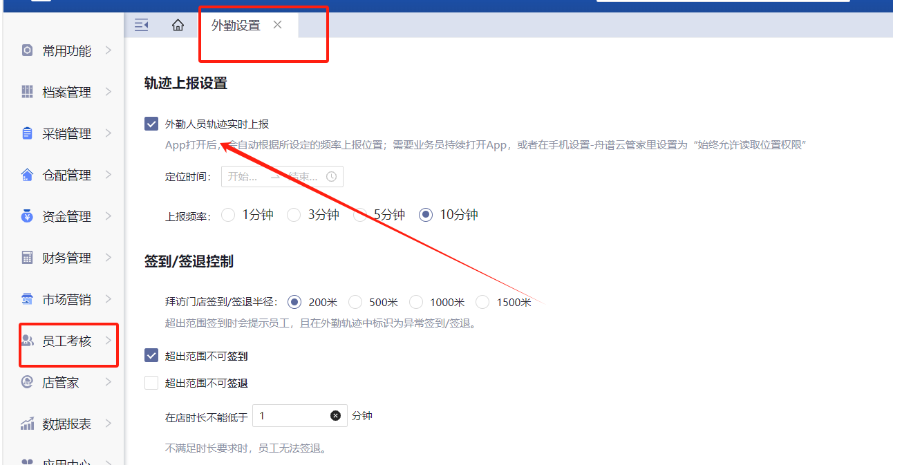 操作入口:员工考核--外勤设置--外勤人员轨迹实时上报,业务员的定位也要打开即可。