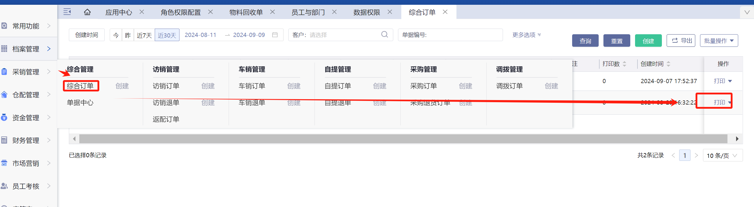 采销管理-综合订单-打印,可以合并在一起打印。
