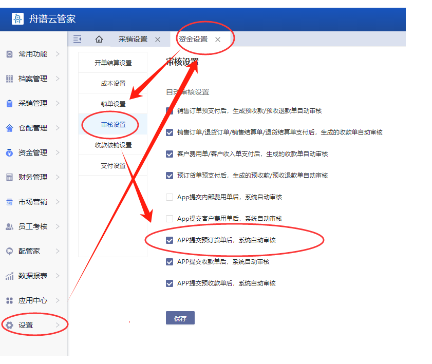 操作入口:设置--资金设置--审核设置,勾选APP提交预订货单系统自动审核。
