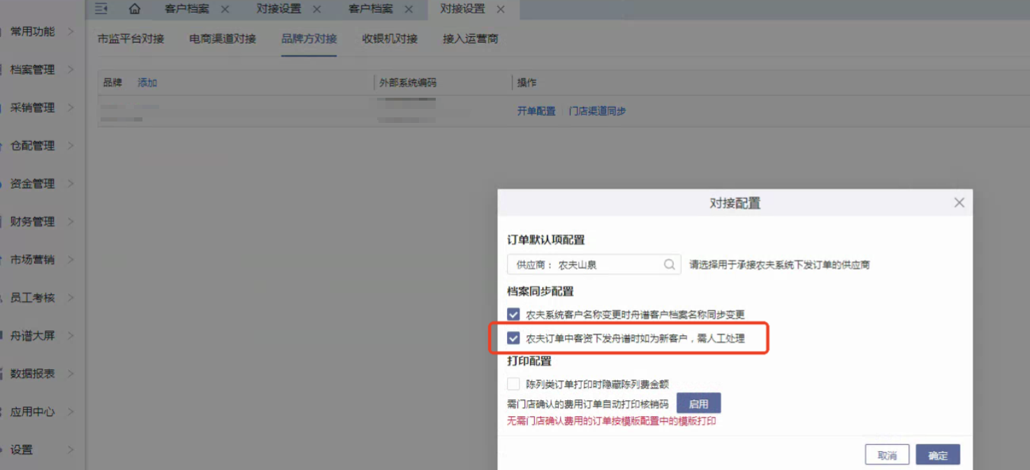 1、新客户:检查设置-对接设置-品牌对接,勾选农夫订单中客资下发舟谱时如为新客户,需要人工处理。需要在舟谱首页-农夫客资进行审核(参考图二);
