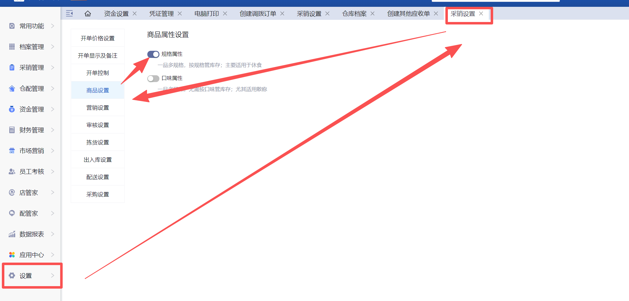 3、操作入口:设置-采销设置-商品设置-规格属性-关闭即可。