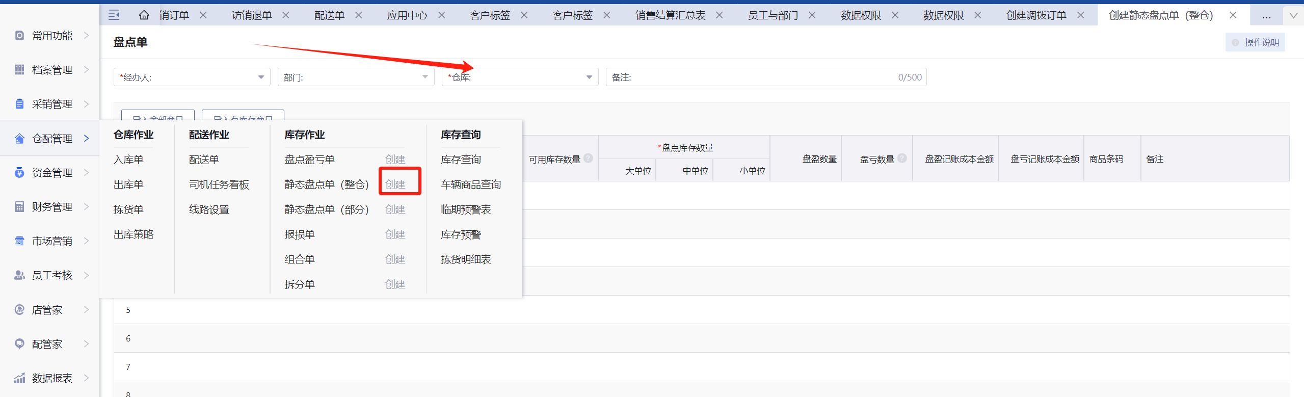 第二步:仓配管理-盘点单整仓,把A仓库全部盘点为B仓库的库存;