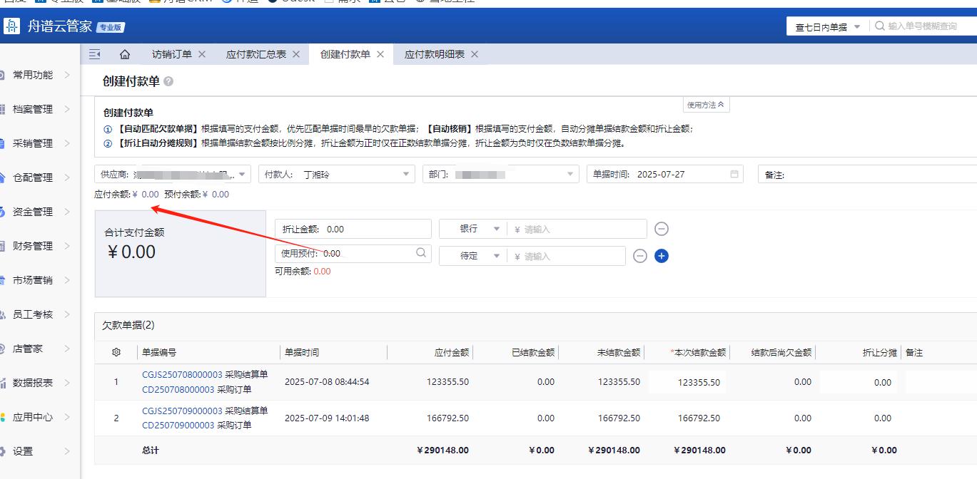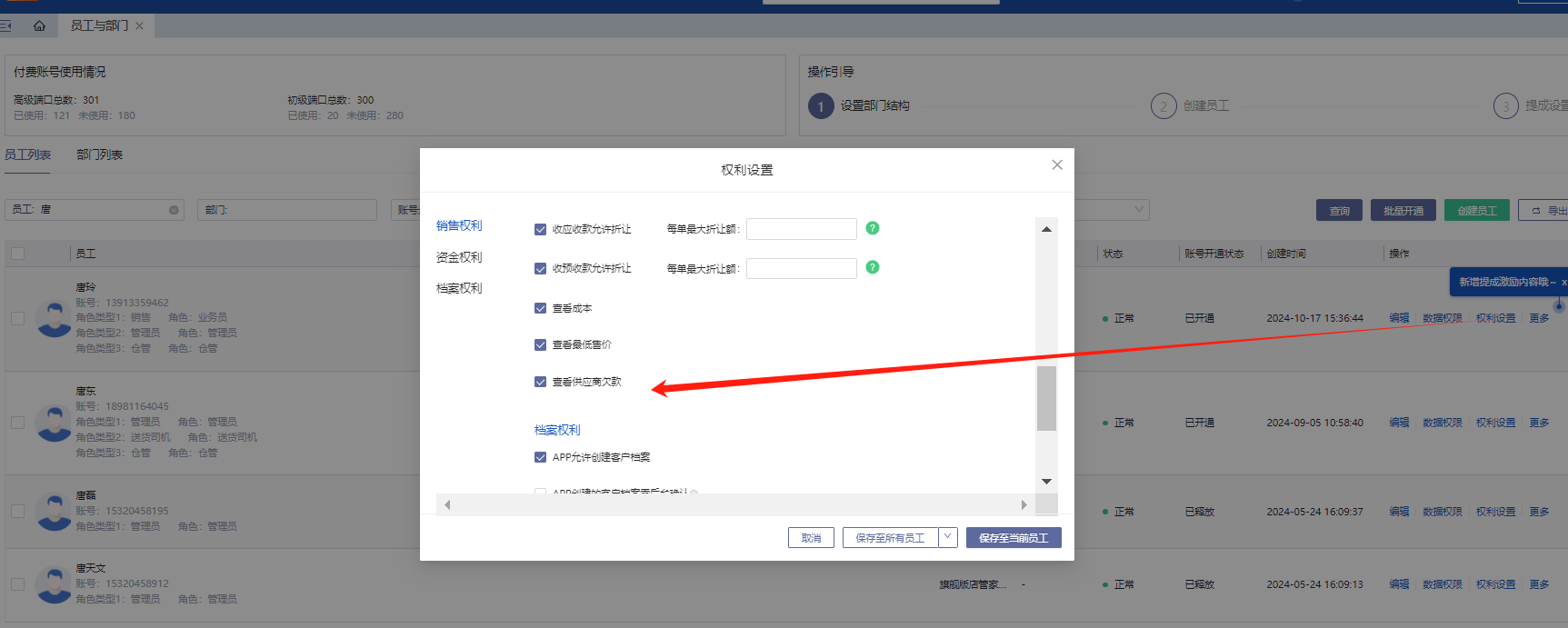 员工与部门-权利设置-勾选查看供应商欠款就能看到。