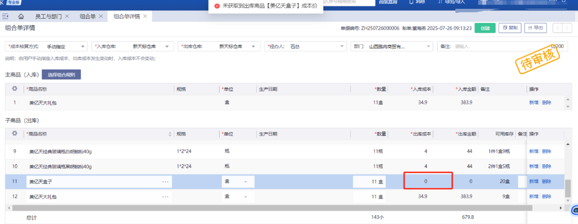 商品有结存成本单价,做组合单获取不到成本?