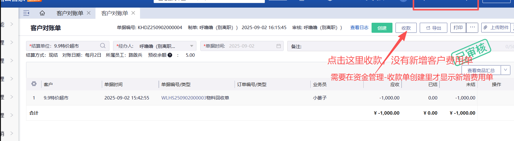客户对账单页面收款的时候不支持新增客户费用单,只有收款单创建页面可以