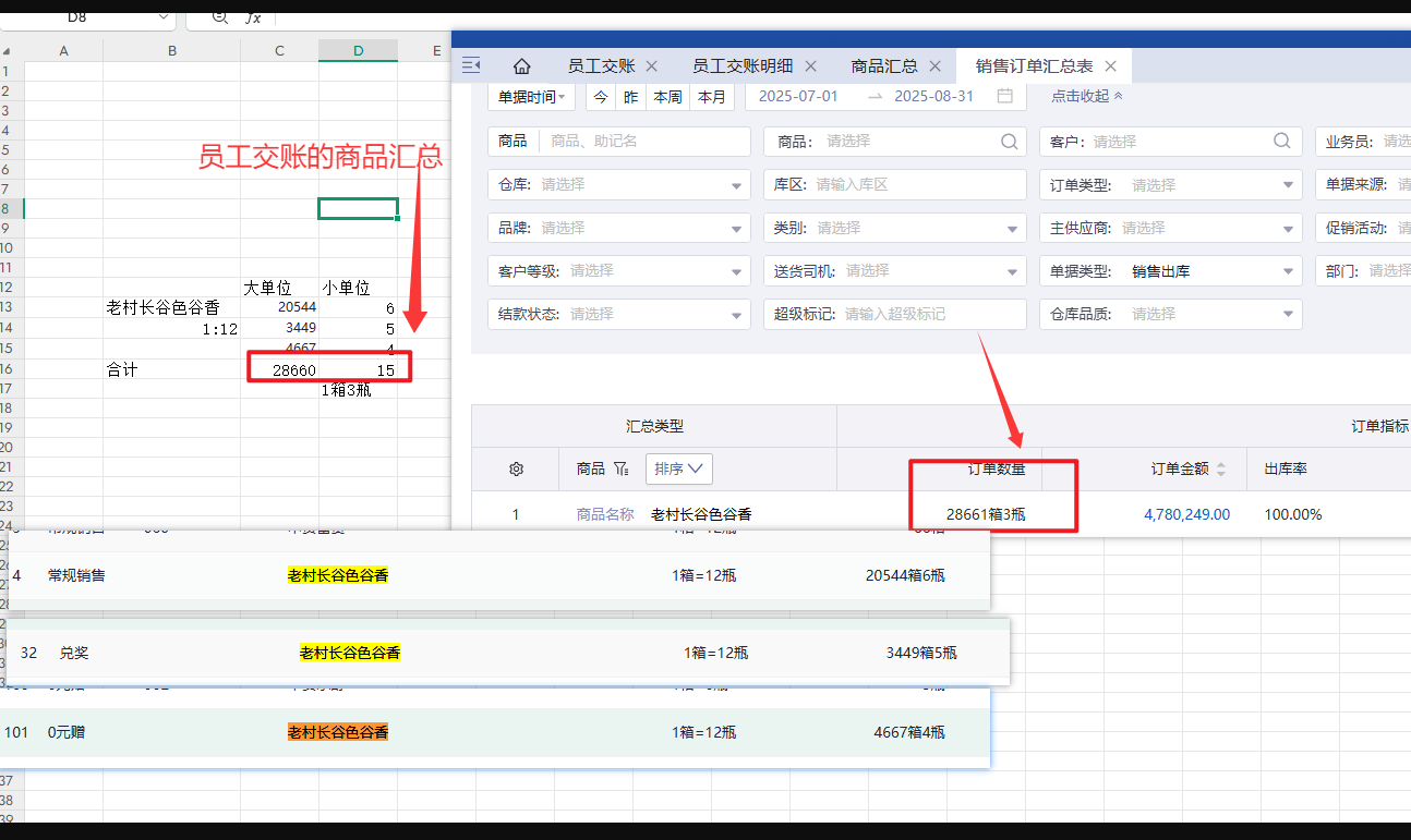 员工交账商品汇总是分业务属性统计,每个业务属性维度下面全部向上换算,换算后,剩下的小单位,不会再在总计里面加起来向上换算