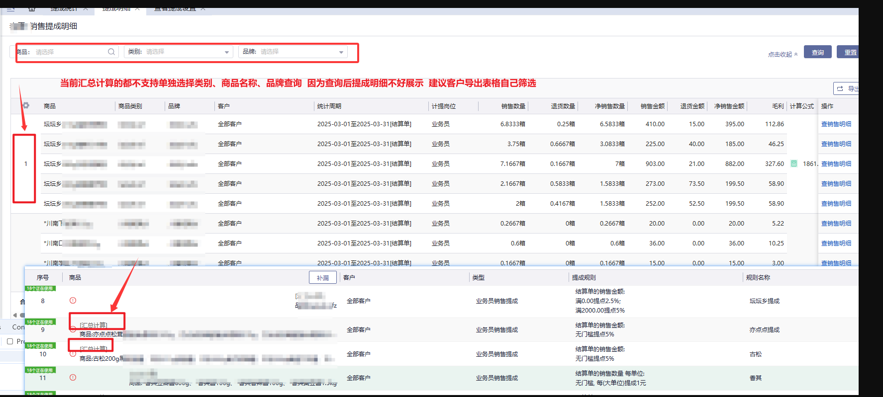 当提成设置的时候是按照汇总的方式来计算,那么对于提成明细里筛选条件:商品、品牌、类别都是不支持单独筛选的,建议导出后自行筛选下