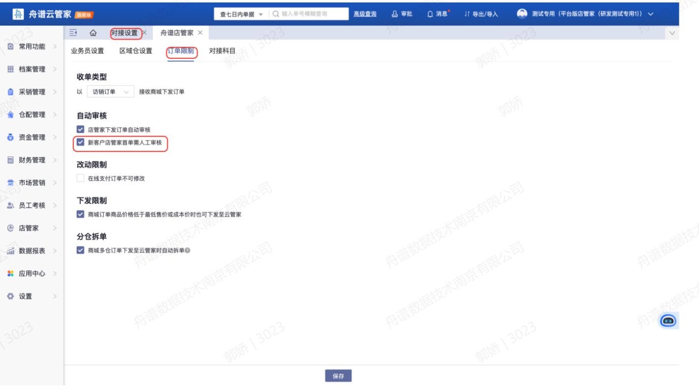 在店管家对接设置-订单限制-⾃动审核中,增加【新客户店管家⾸单需⼈⼯审核】。勾选后,新客户商城⾸单必须⼈⼯审核。