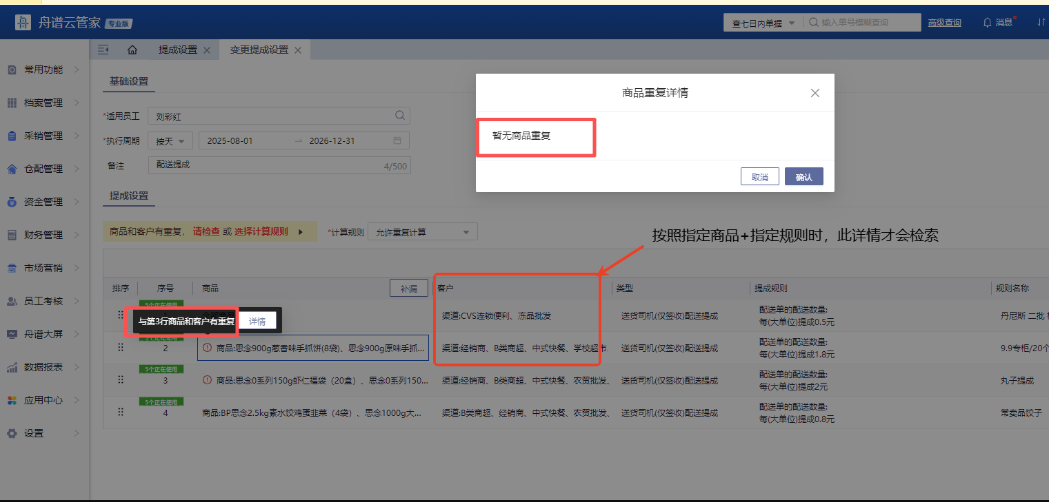 现在是 指定商品且指定客户 ,才会展示具体重复商品,如果是按规则的,则不展示。