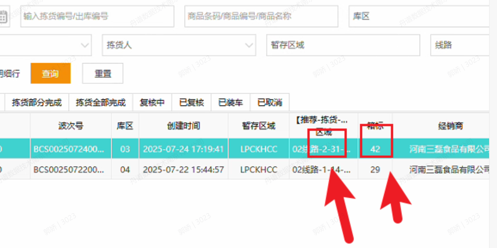 如下图:2-31-42大取值则是2-31是区号,42是复核时输入的箱标,可在出库管理-拣货单查看。