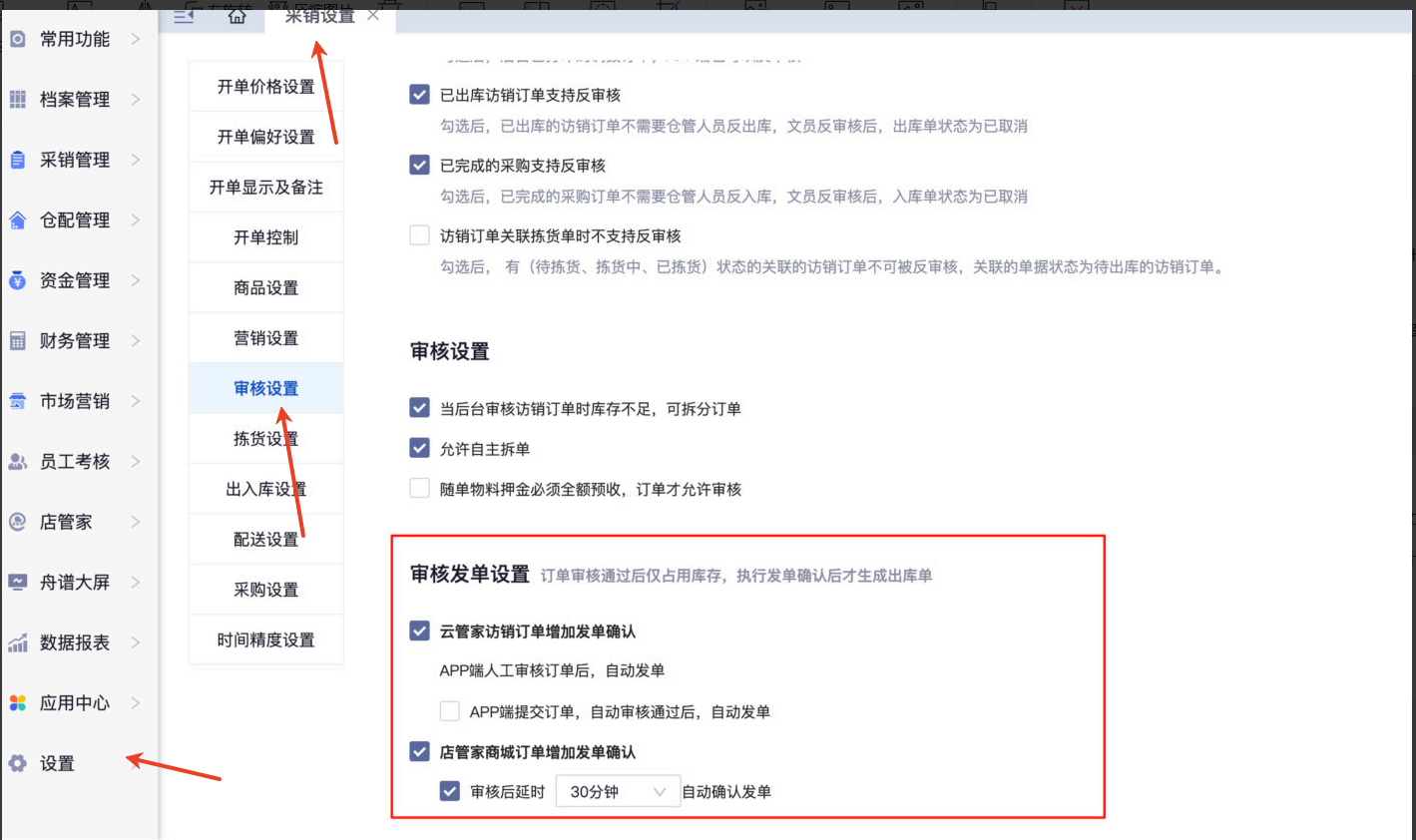 配置:在采销设置-审核设置中,勾选「云管家访销订单增加发单确认」配置项。 针对app,可勾选是否自动发单 勾选配置后,单据审核后仅占库存不生成出库单,操作发单后生成出库单。