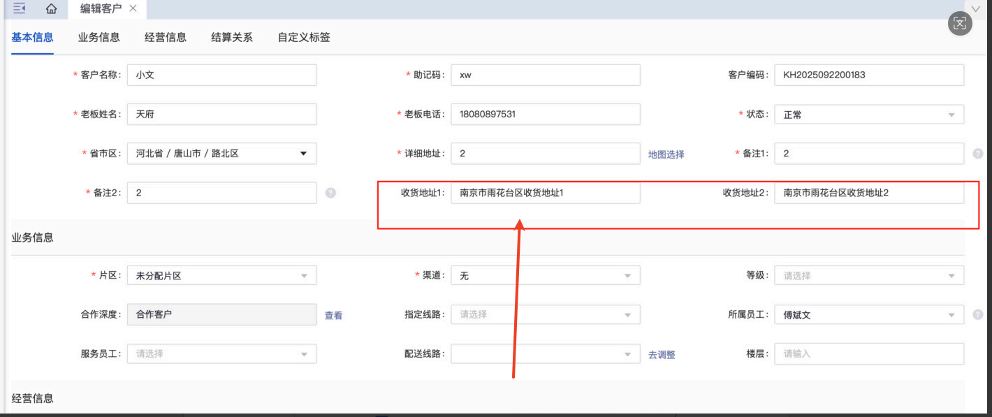 1.客户档案中除原标准地址外,可设置「客户地址1」「客户地址2」。 仅可在web端输 入,仅支持文字,不支持经纬度,不参与地图调度