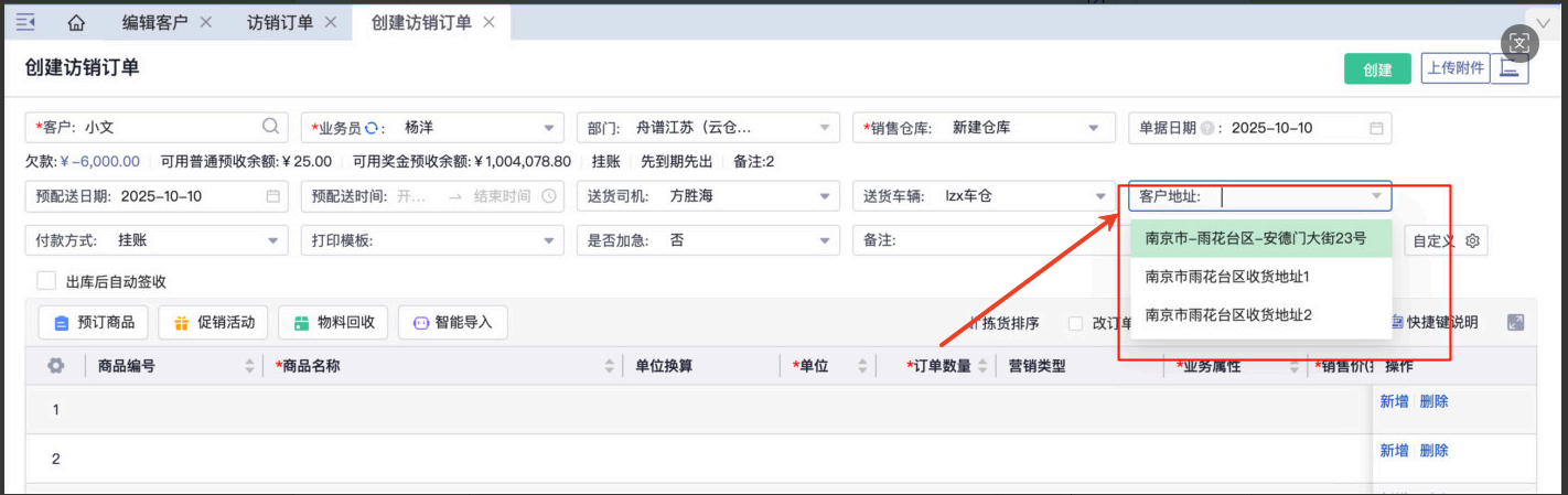 2.访销订单中可选择客户的收货地址,配送单中的客户地址取值为订单中选择的地址。