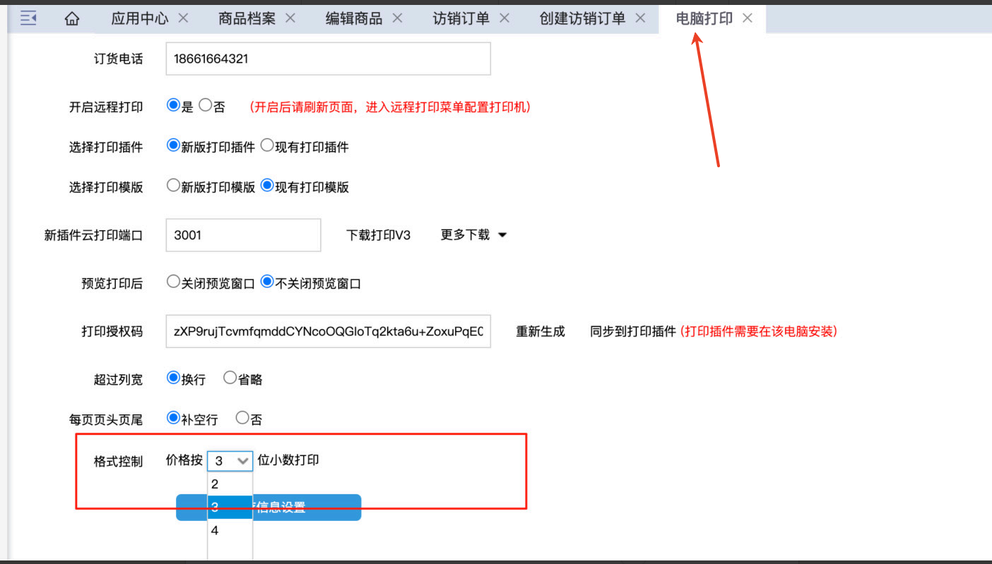 可以自定义设置打印位数。在设置-电脑打印-格式控制处配置。