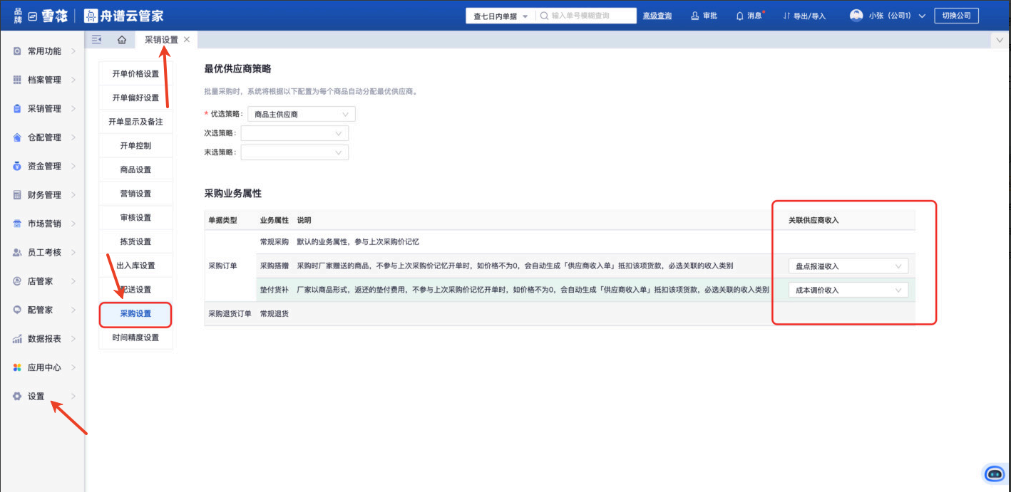 首先必须先在【采销设置-采购设置】中,选择“采购搭赠”“垫付货补”关联的“供应商收 入”;