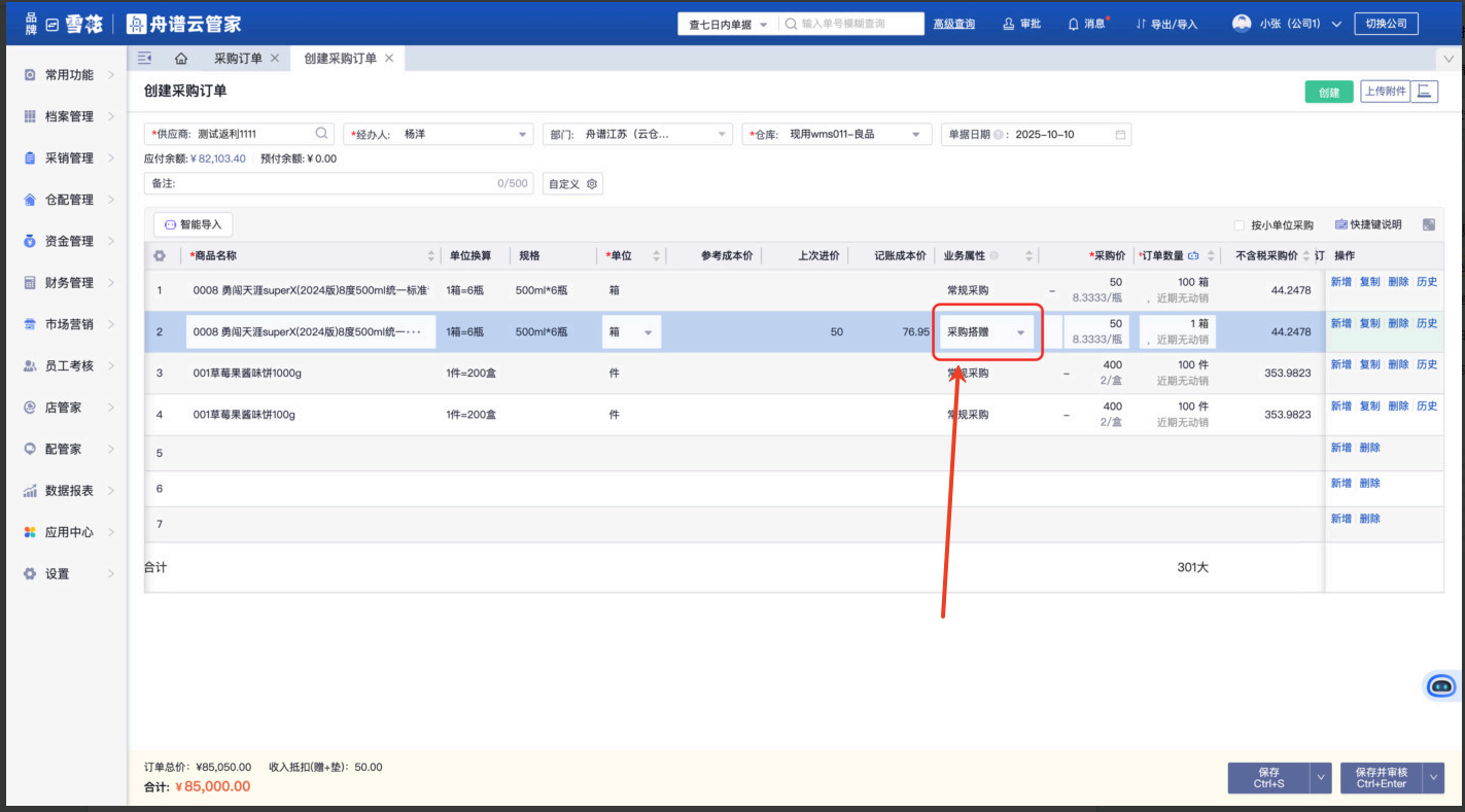 开单时,业务属性可以选择“采购搭赠”“垫付货补”;