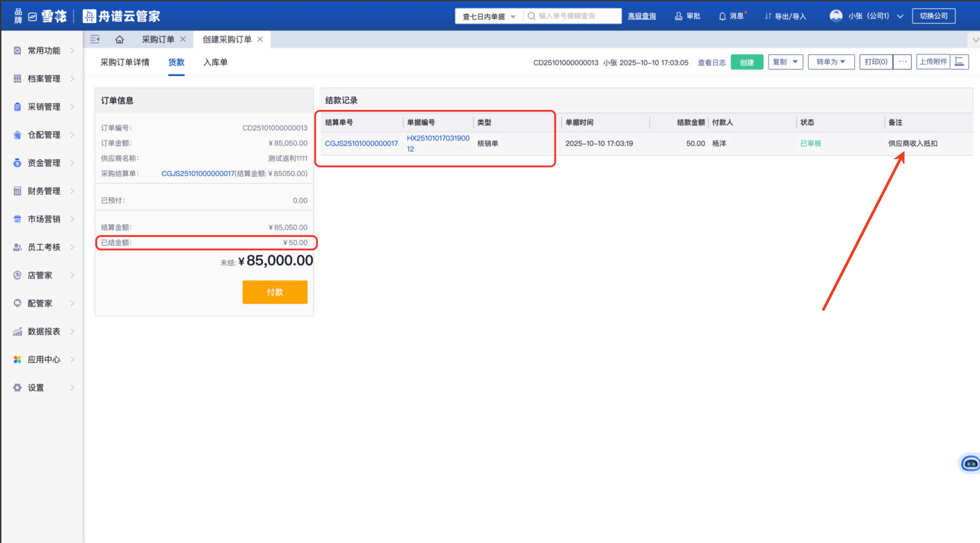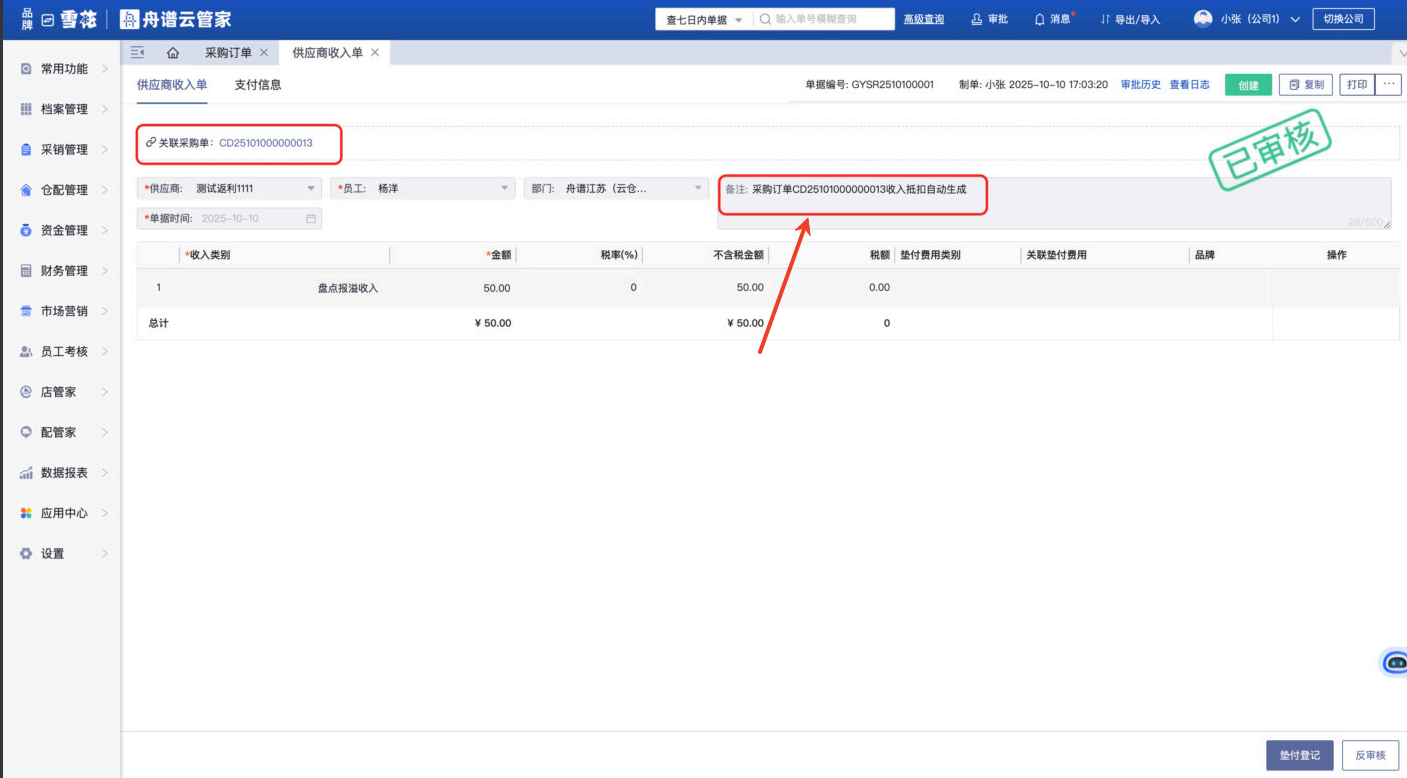 如果“采购搭赠”“垫付货补”的订单金额不为0,则在入库后,系统将自动生成供应商收入单 冲抵这2个属性的入库商品的应付货款;