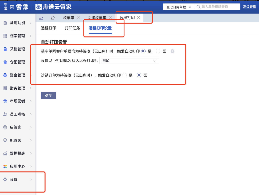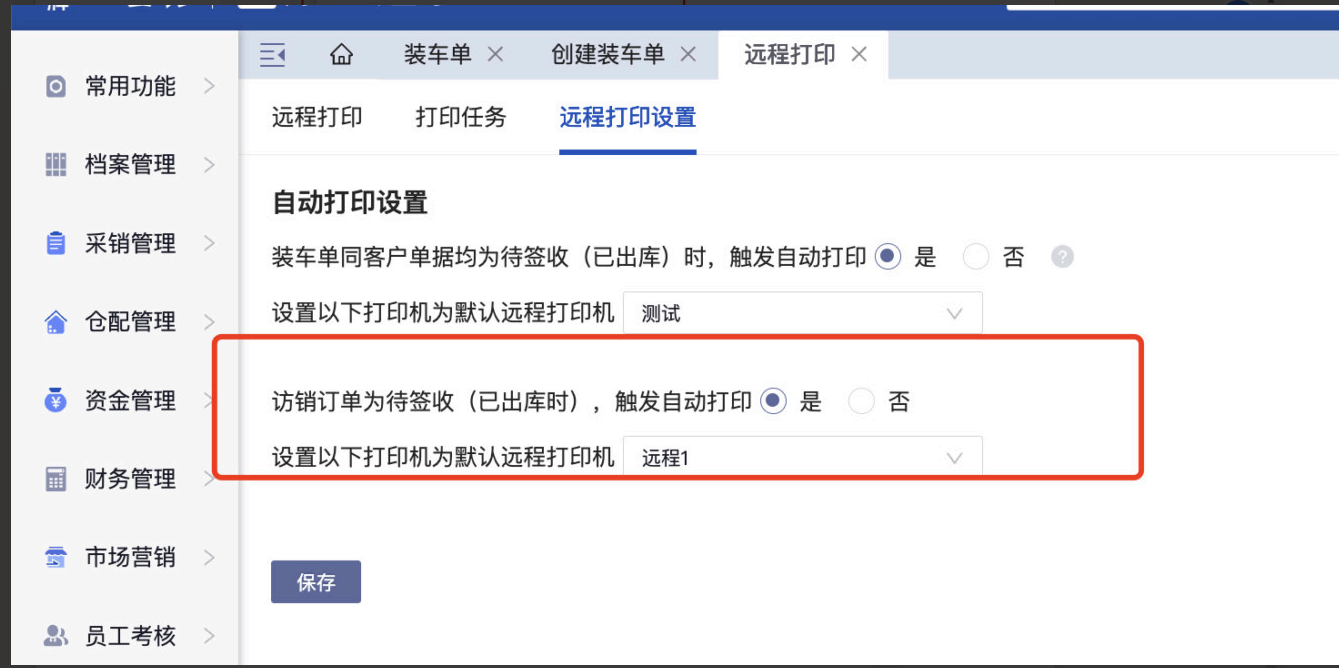 注意: 装车单中同客户打印与订单出库的自动打印,开启一个即可;