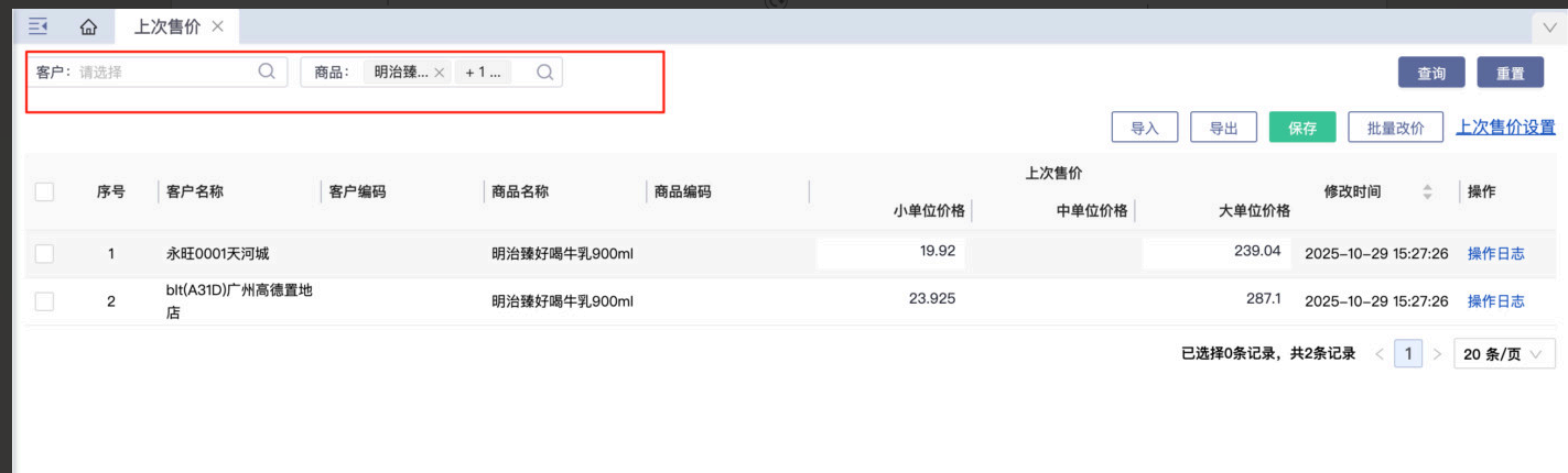支持。上次售价⽀持多选客户和商品,⽀持按⽐例/数值批量调价。(同时支持导入)