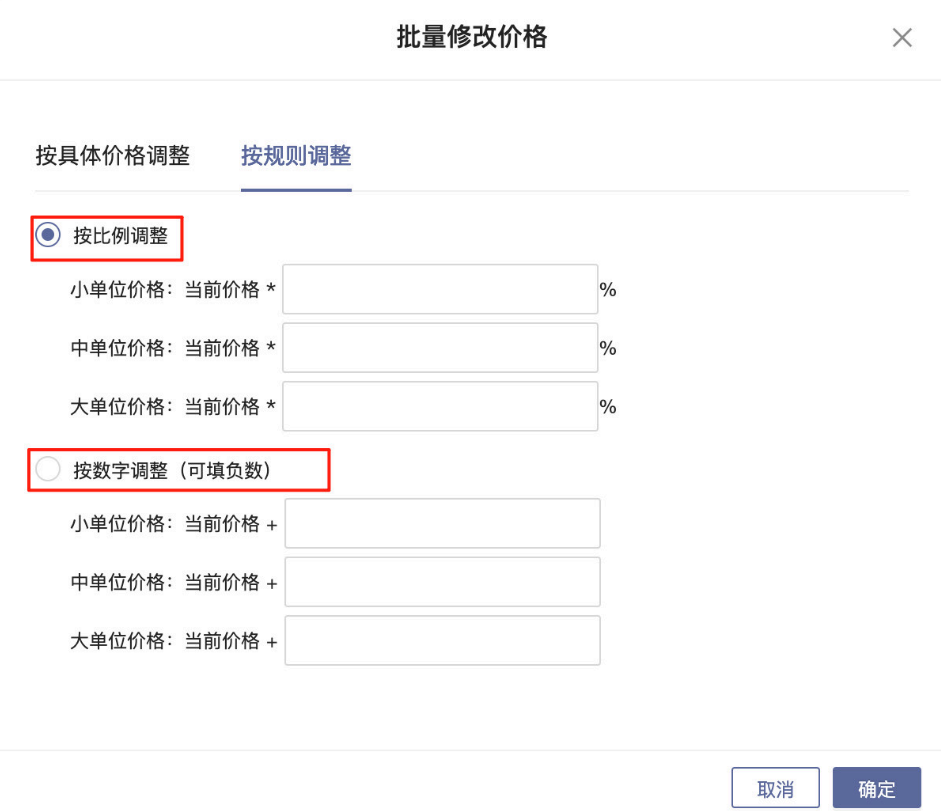 2.批量修改上次售价时,除可以调整为具体价格外,额外⽀持按规则调整。可在原价格基础上调整⽐例或加减数值